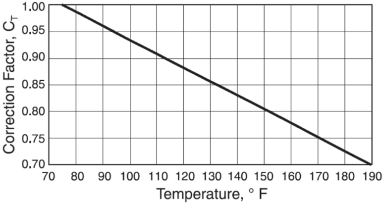 하지만 이 capacity는 가스가 물로 포화되지 않았거나 온도가 75F이상일 경우에는 adjusted되어야 한다. 아래는 mol sieve의 correction factor이다.