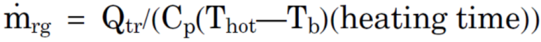 이는 total heat의 40%만이 hot 가스로부터 bed, vessel로 열전달 그리고 대기로 heat loss를 고려하고 나머지는 hot gas 형태로 나간다는 의미임. 재생가스 유량은 아래 식으로부터 계산이 된다.
