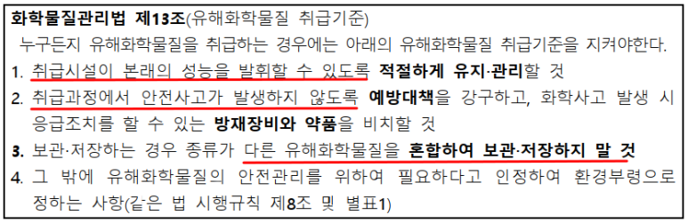 2) 유해화학물질의 외부유출 방지를 위해 설치된 방류벽, 트렌치 등 집수시설에 물이 고여 있을 경우, 유출된 유해화학물질과 반응하여 (물반응성) 2차 사고 및 피해가 발생할 수 있음.