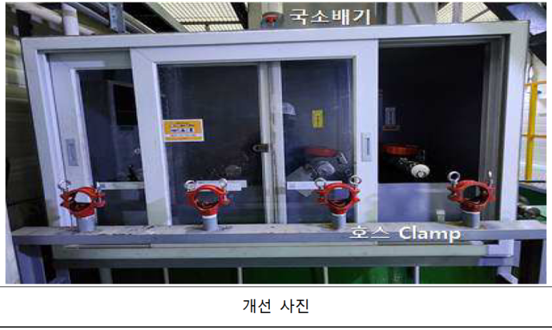 6) 유해화학물질 주입구에 주입호스용 클램프를 운영, 주입중 발생할 수 있는 위험 요인을 제거하며, 주입으로 발생할 수 있는 가스상의 오염물질을 국소배기장치에 유입처리하는 사례임.