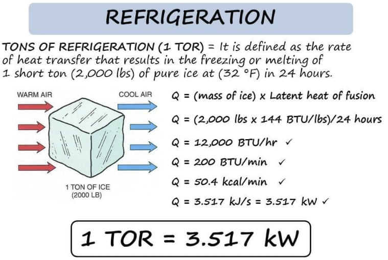 1RT는 24시간 동안 0degC에서 얼음이나 물의 1 short ton (2,000lb or 907kg)의 melting이나 freezing을 야기하는 열량으로 정의된다.