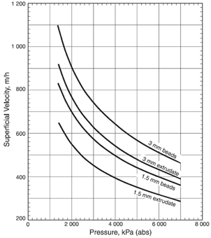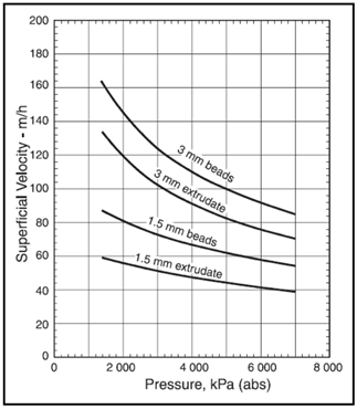 가스 조성을 가정하고 ΔP/L를 7.5 kPa/m로 가정하여 아래 그림이 유도되었다. Bed를 통한 설계 차압은 35kPa이며, 55kPa이상이면 desiccant가 깨질 수 있고, 전체적인 bed 무게와 차압 force로 인해 crushing될 수 있어서 추천되지 않는다. 따라서 bed높이가 결정이 되면 꼭 pressure drop을 check해야 한다.