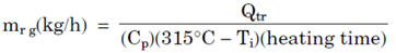 Total heating time은 전체 재생기간의 50~60%정도이며, 8시간 adsorption cycle에 대해 가열은 4시간 30분, 냉각은 3시간, 그리고 나머지 30분은 stand-by 및 switching시간이다. Cycle이 좀 더 긴 경우에는 최소 pressure drop인 230 Pa/m가 유지된다면 가열시간이 연장될 수 있다. 재생에 요구되는 가스량은 아래 식을 통해 계산한다.