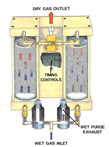 가스로부터 수분을 흡착하는 여러 종류의 흡착제가 있으며 이를 재생하기 위한 시스템이 별도로 설치된다. 가열된 가스를 이용하여 desiccant에 흡착된 물을 탈착시켜 제거한 후 vessel은 다시 가열되지 않은 가스를 이용하여 냉각시킨 후 stand-by mode로 유지된다.