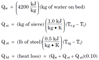 Qw는 물의 탈착을 위한 열량이고, Qsi는 sieve를 재생온도까지 올리기 위한 열량이고, Qst는 vessel과 배관을 재생온도까지 올리기 위한 열량이고, Qhl은 재생 열 손실을 의미한다.