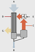 MVR evaporator는 heat pump system 개념을 적용하여 separator에서 flash된 증기는 Evaporator에서 필요로 하는 온도에 상당하는 압력으로 재가압하여 다시 열원으로 사용되며, 응축된 물은 feed인 폐수의 예열에 사용되어 에너지 효율을 높인다. shell로부터 전달된 잠열에 의해 2phase가 separator로 가서 분리후 vapor는 재압축되고 liquid는 feed와 섞여 pump에 의해 recirculation되어 evaporator top tube로 공급된다. Overall heat balance를 위해 필요시 steam이 make-up (D)되거나 excess steam이 release (C)될 수 있다.