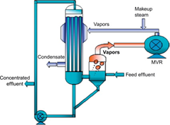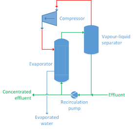 공정내 폐수나 sludge가 펌프에 의해 feed-effluent 열교환기를 통해 circulating stream으로 join되며 이 열교환기에서는 hot condensate의 현열을 전달하여 공정 폐수를 예열한다. Circulation pump는 separation tank로부터 농축된 액체를 evaporator를 통해 순환시킨 후 다시 separation tank로 보내어 closed loop를 형성한다. 이 때 compressor로부터 압축된 vapor의 잠열이 tube내부의 액체에 전달되어, vapor는 응축된 후 hot condensate형태로 system밖으로 배출된다.