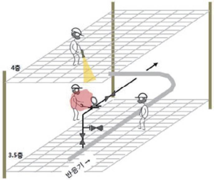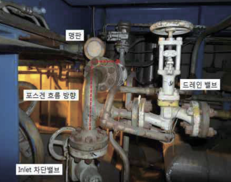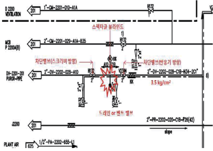 - (작업절차 미준수) 맹판 설치 및 제거 관리 절차서에 따라 배관의 맹판을 해체할 경우 맹판을 해체하여야 할 연결 배관에 vent 또는 drain을 open하여 압력과 유체 존재유무를 확인하도록 되어 있으나 배관에 잔류한 포스겐 가스를 vent하지 않음.