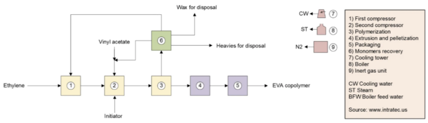 EVA는 고압 반응기에서 Ethylene과 Vinyl Acetate가 Free-radical 첨가 중합을 통해서 연속 공정(Continuous process)으로 생산된다. 이것은 Initiator가 깨져 Free Radical을 형성하고, 과량으로 투입된 이중결합 단량체(Vinyl Monomer)들과 연속적으로 반응하는 Chain-Growth 중합법이다.