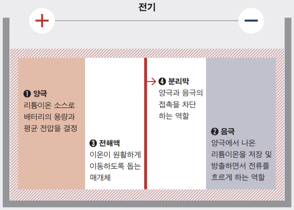현재 사용되고 있는 주류 이차전지는 리튬이온 전지인데, 기본적으로 리튬이온이 양극재와 음극재 사이를 이동하는 화학적 반응으로 전기를 생산하는 원리다. 이때 양극과 음극 사이에서 리튬이온의 이동통로 역할을 해주는 물질인 전해액과, 양극과 음극이 닿지 않고 전해액에 다른 물질이 침범하지 않도록 방어해주는 분리막이 필요하다. 그래서 양극재, 음극재, 전해액, 분리막을 리튬이온 전지의 4대 구성요소라고 한다. 이 4대 구성요소 중의 하나인 양극재의 전(前) 물질이 바로 전구체다. 전구체란 어떤 화학반응을 통해 A라는 물질을 만들 때, 최종 물질인 A가 되기 바로 이전 단계의 물질을 의미한다. 즉, 이차전지의 양극재용 전구체란 양극재가 되기 이전, 양극재의 원료가 되는 물질을 뜻한다. 전구체는 이차전지의 특성을 결정하며 리튬과 결합해 양극재가 된다.