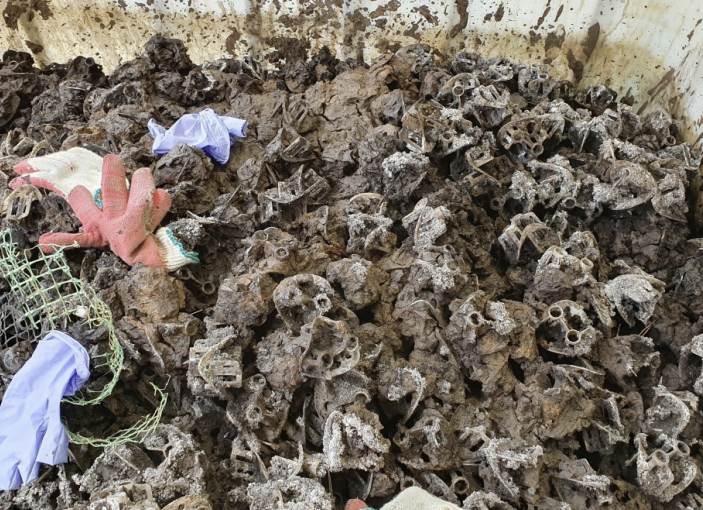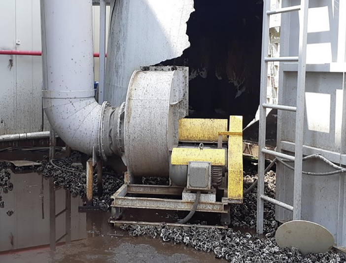 찌꺼기가 끼어있는 세정탑(스크러버) 내부 충진재