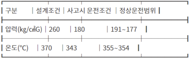 o 따라서 고온(380℃), 고압(200㎏/㎠)하에서 운전되는 사고 배관은 이상과 같은 수소 취성등에 의하여 균열이 발생하고 열화에 의한 임계점을 초과하여 내용물 누출에 의한 폭발·화재가 발생한 것으로 판단됨.