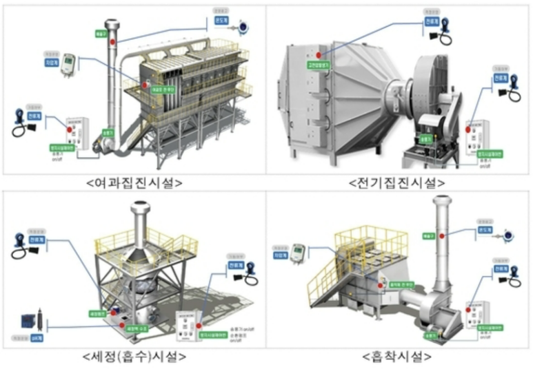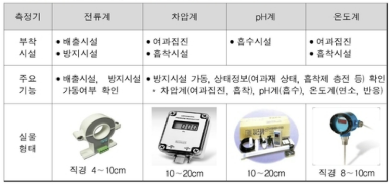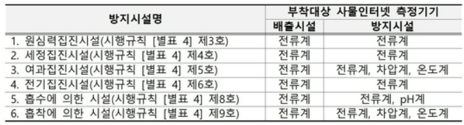 아래와 같은 6개 종류의 방지시설 사업장에 사물인터넷 측정기기 4종 (전류계, 차압계, pH계 및 온도계)을 방지시설 특성에 따라 부착해야 한다.