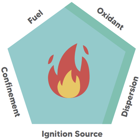 분진폭발의 5요소는 기존의 폭발 3요소인 산소, 분진연료(Combustible Dust), 발화원에서 부유분진(분진이 공기 중에 떠다니고 있을 것)과 밀폐된 공간내에 있을 것이라는 2가지 조건이 추가되어 확장된 것으로, 분진 혼합물의 경우 중력의 영향을 많이 받으며 분진/산화재 서스펜션의 형성은 분진폭발의 전제조건이라 할 수 있다.
