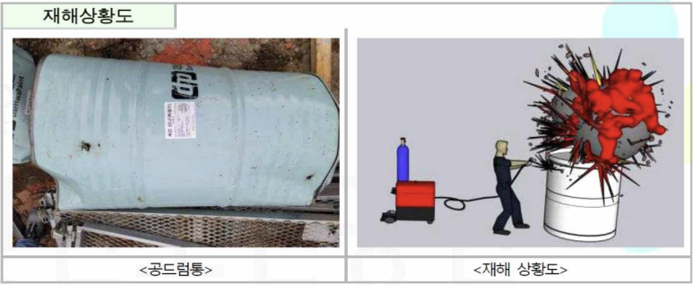- 2019.12.11. ㈜○○○에서 공드럼 상판을 절단하던 중 폭발하여 사망