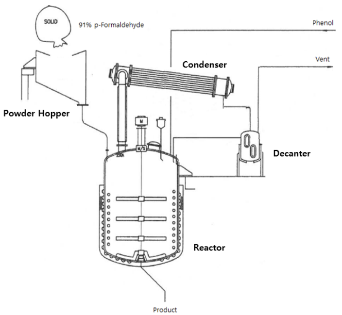 페놀은 배관을 통해 반응기로 공급되며 파라포름알데히드는 고체 상태로 호퍼를 통해 반응기로 유입된다. 원료 투입 후 염기성 촉매인 50 % NaOH를 반응기로 투입하고 반응시킨다. 60 ℃까지 승온된 후 10분 유지 후 90 ℃ 까지 승온되어 일정시간 유지된다. 일정 시간 후 45 ℃로 냉각시킨 후 첨가제를 투입하여 포장, 출하한다. 반응기 Jacket에 147 ℃ 스팀을 공급하여 승온하고, Jacket 및 Coil에 냉각수를 공급하여 제품을 냉각한다.