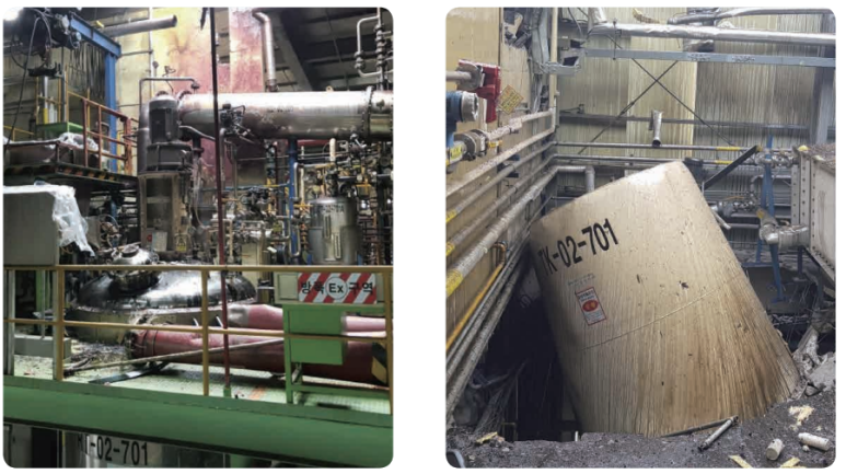 폭발로 파손된 열교환기(좌)와 비산된 반응기 커버(우)