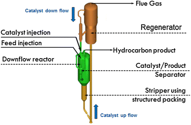 feed injection nozzle을 통해 들어온 feedstock은 riser (1)에서 짧은 체류시간동안 분산되고 증발되어 촉매와 선택적 반응을 한다. riser에서의 온도 프로파일은 proprietary MTC (Mixed Temperature Control) system (2)에 의해 최적화된다.