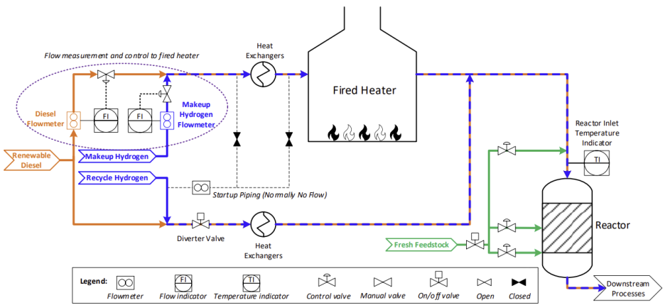 다만 renewable fuel내에는 산소 함량이 많아 연료로서 안전성을 위해 이를 수첨반응시켜 산소를 수분으로 전환하는 hydroprocessing공정이 있으며 아래 PFD와 같다.