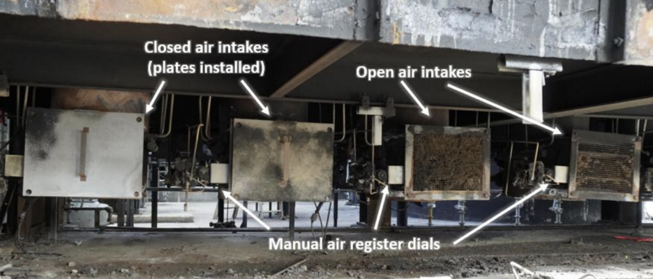 Burner air intakes, cover plates, and air register dials at each burner. (Credit: CSB)