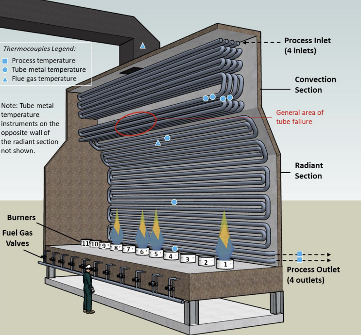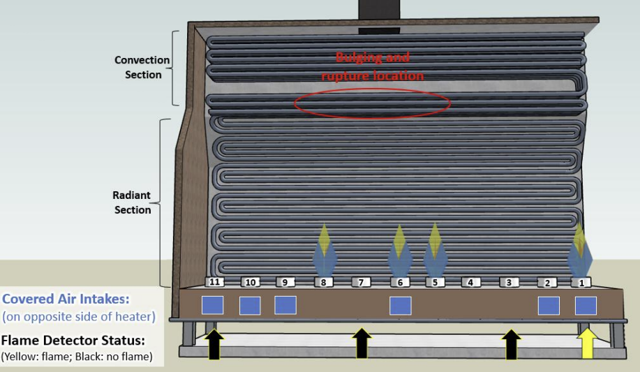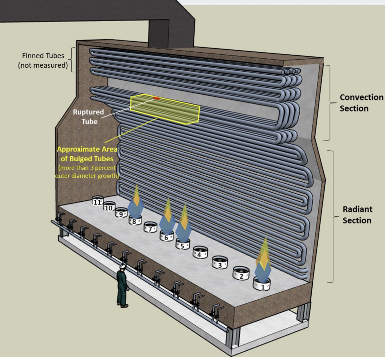 Heater illustration depicting tube damage found upon internal inspection postincident. Note: The lit burners do not necessarily depict their actual state at the time of the incident. (Credit: CSB)