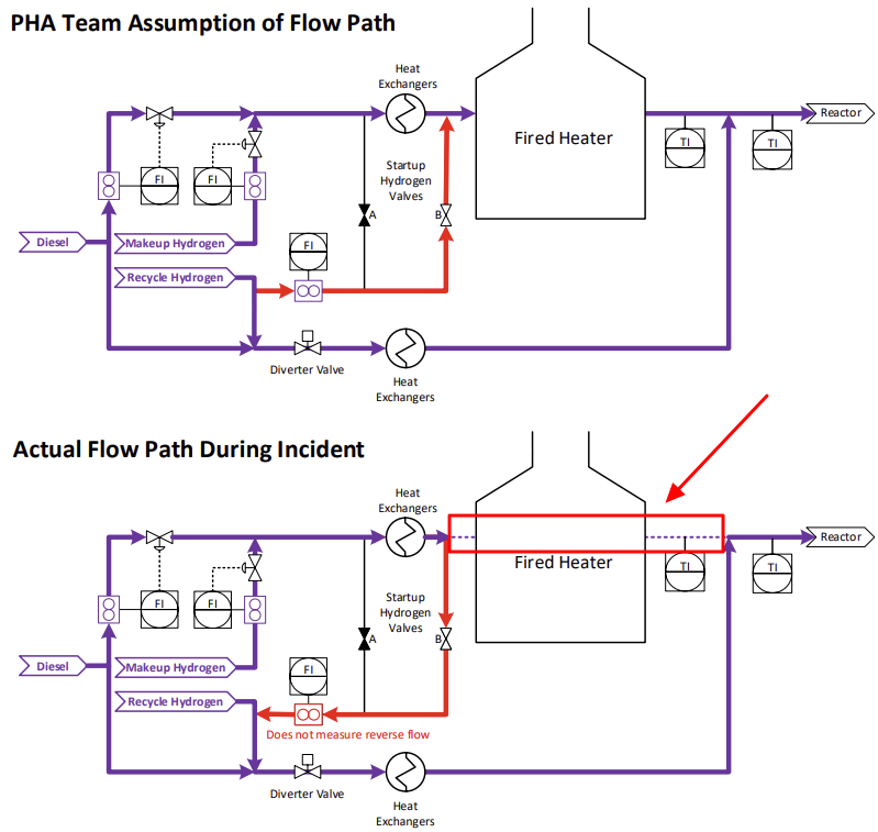 Flow path assumed by the PHA team compared with the actual flow path during the incident. (Credit: CSB)