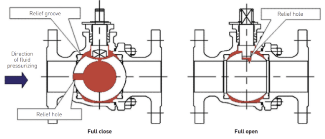 valve의 upstream side로 작은 구멍을 뚫어 valve가 닫힐 때 ball 내부에 형성된 액체의 팽창에 따른 압력을 upstream으로 배출할 수 있다. valve에는 flexible graphite packing이 설치되고, gasket은 저온에 견딜 수 있는 재질이어야 한다. 2"이하는 vent hole이 있고 3"이상은 upstream side에 seat spring이 있어서 비정상적인 압력을 방지하여 안전도와 신뢰도를 높인다.
