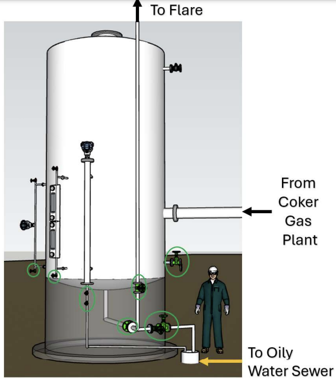 Fuel Gas Mix Drum during overfill and attempted emptying. Liquid exit locations are shown in blue. (Credit: CSB)