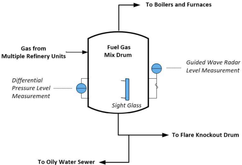 Simplified drawing of the BP Toledo Refinery Fuel Gas Mix Drum and associated level instrumentation.c (Credit: CSB)