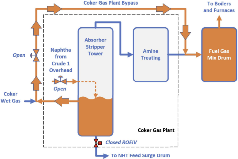 Overflow path from Coker Gas Plant to Fuel Gas Mix Drum (orange arrows).a(Credit: CSB)