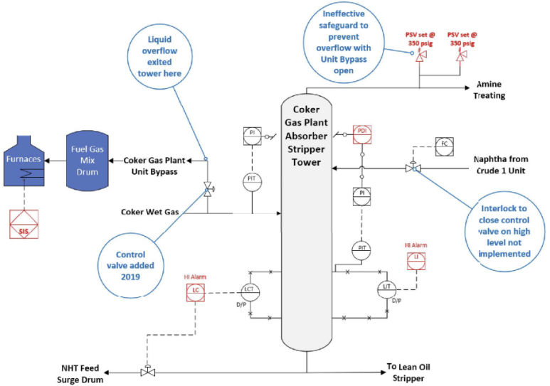 Absorber Stripper Tower safeguards identified in the 2020 Coker Gas Plant PHA, shown in red. (Credit: CSB)