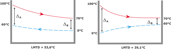 향류의 경우 병류보다 온도차이가 크기 때문에 열전달이 더 잘 일어나며, 열전달 면적이 더 적게 요구되지만 공정 특성상 어느 한 유체의 출구온도가 다른 쪽 유체의 출구온도보다 낮거나 또는 높아지면 문제가 생길 경우 병류를 고려하여 물리적 제한을 두기도 한다.