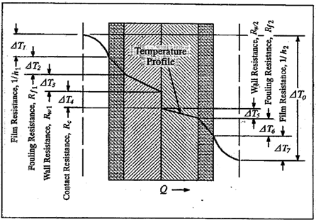 고온측에서 저온측으로 열이 전달되는 과정에서의 각 항목별 (유체 경막저항, 오염저항, 벽저항) 열전달 저항들에 대한 합이 총괄 열전달의 총괄 저항이며, 이 총괄 저항의 역수가 총괄 열전달 계수가 된다.