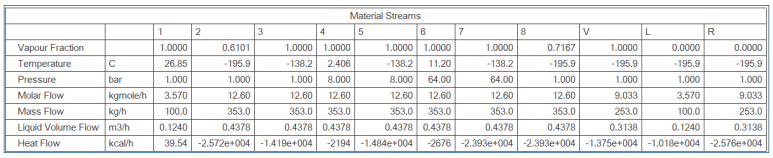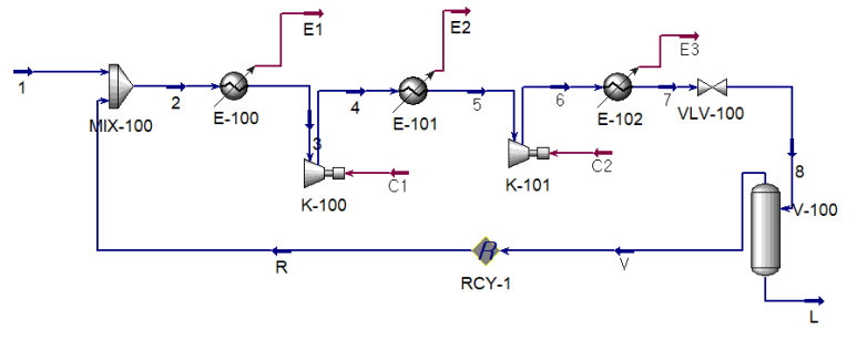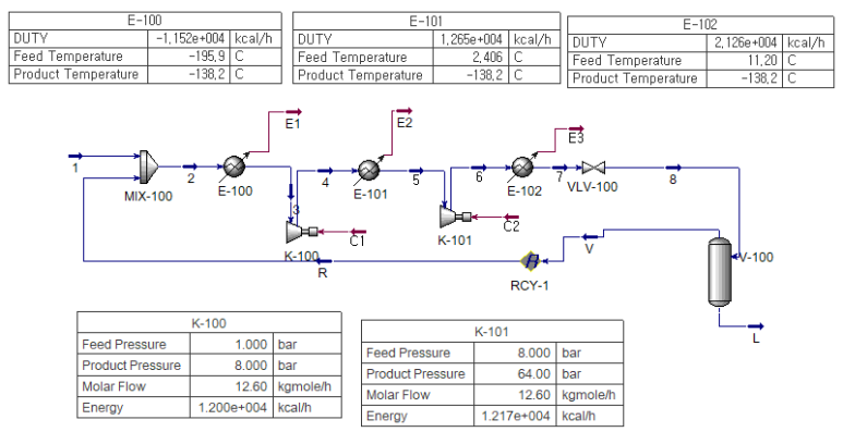 질소 253kg/h를 circulation하면서 feed인 100kg/h와 mixing후 가압과 냉각을 거치면서,