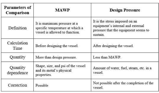 API579에서도 MAWP를 결정하기 위한 기준이나 절차에 대해 언급하고 있다. 설계압력은 공정 목적상 최대로 견뎌야 하는 압력이며 이를 기준으로 계산하여 필요로 하는 최소 두께를 결정한다. 반면 MAWP는 제작된 압력용기 기반으로 실제적으로 damage나 failure없이 안전하게 운전될 수 있는 최대 압력이다.