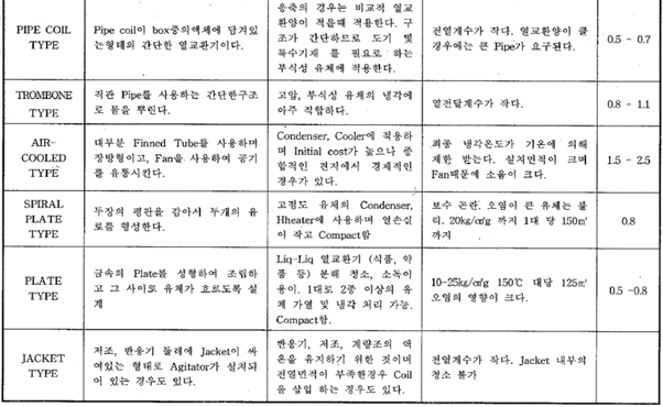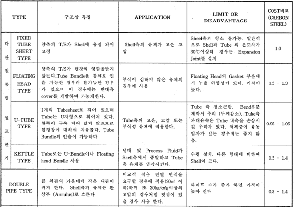 공정조건, 설치장소, 경제성을 고려하여 적합한 열교환기 type을 적용하기 위해 각 종류별 구조, 장단점 및 특성을 파악해야 한다.