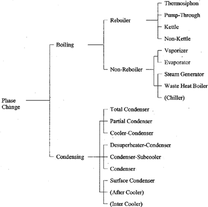 공정 목적상의 분류로서 양쪽 유체중 어느 유체에 주 관점을 두느냐에 따라 달라질 수 있으며 주로 공정유체를 기준으로 하되, 크게는 상변화 유무 관점으로 category를 나눌 수 있다.