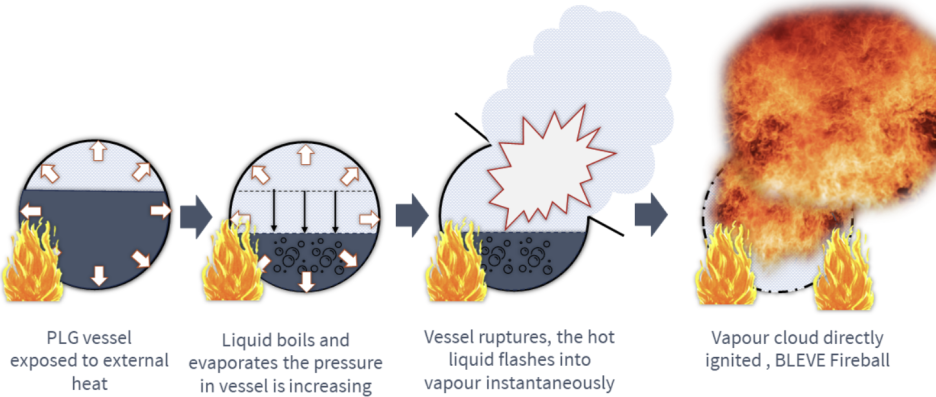 이와 같이 생성된 증기구름과 미스트가 어떤 점화원과 접촉하게 되면 fire ball 또는 flash fire가 형성되면서 BLEVE 사고가 발생된다. 이와 같이 폭발에 의해 사고가 발생하면 인적피해가 클 수밖에 없다.