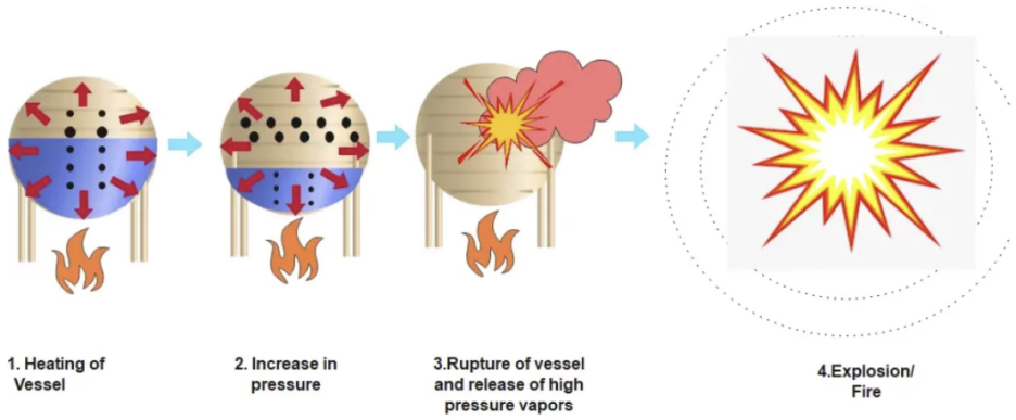 BLEVE는 밀폐된 용기에 대기압보다 높은 압력상태로 저장된 인화성 액체가 외부로 갑자기 누출되면서 발생되는 폭발사고를 말한다. 이때 인화성 액체가 외부로 누출되면서 압력이 갑자기 낮아진 대기압 상태에 놓이게 되므로 인화성 액체가 폭발적인 증발을 일으켜 증기구름과 미스트가 거의 동시에 발생하게 된다.