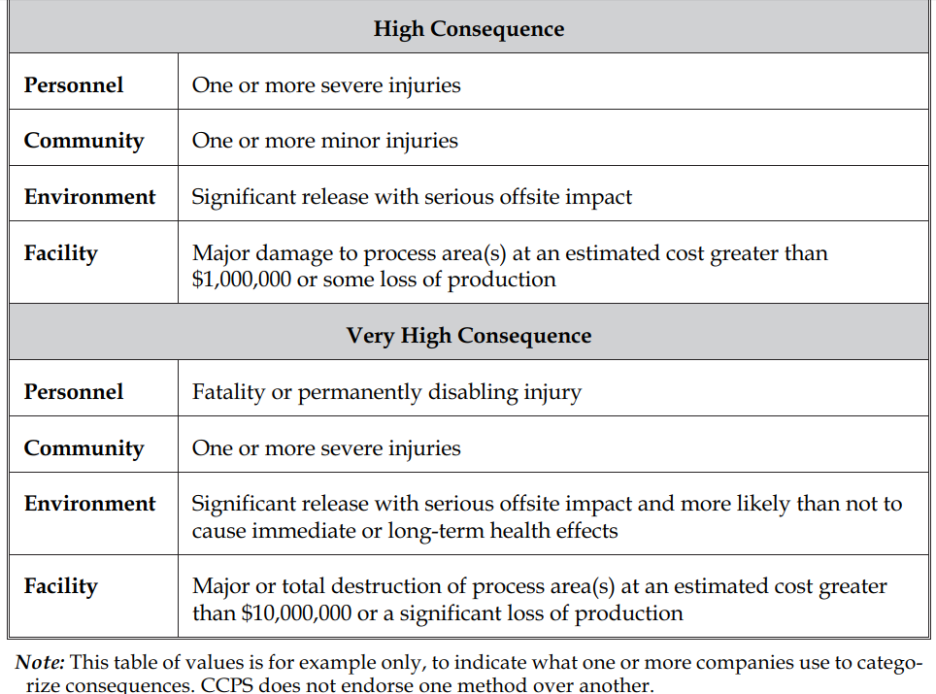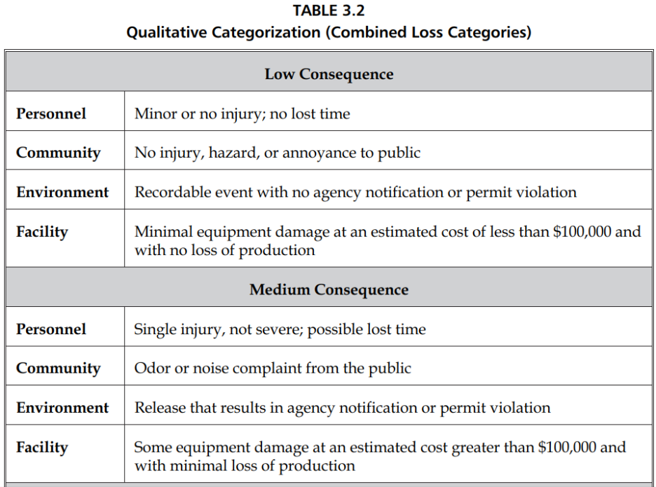 다양한 카테고리로 consequence를 차별화하도록 matrix를 이용하며 잠재적인 운전원에 대한 피해 추정을 피한다. 사람에 대한 피해 예측은 매우 어려워 상대적 위험에 대한 정확한 판단을 하도록 돕는다. 예를 들어 toxic gas가 leak시 피해자가 한명 혹은 여러명 혹은 한명도 없을 수 있다. 이는 release point에 얼마나 가까이 존재하고, 어느 정도 시간동안 있었으며, 얼마나 빨리 그 지역을 이탈할 수 있는지에 따라 다르게 나타난다. 아래는 chemical leak량에 다른 consequence를 다섯 단계로 나누었으며,