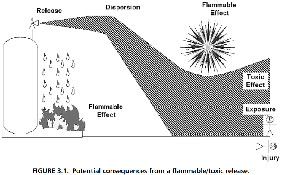 containment loss는 다양한 원인에 의해 가능하며 vessel leak나 pipeline rupture, 대기 방출용 relief valve의 lifting에 의해 누출이 될 수 있다. 위험물의 release에 따른 결과의 sequence는 아래와 같다.