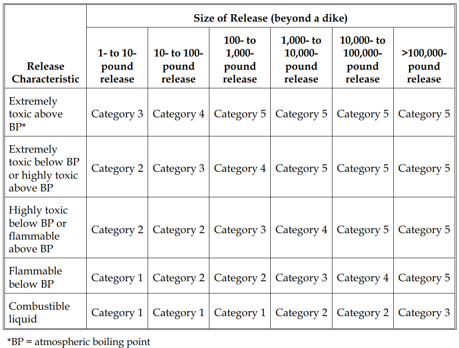 맨위 표는 release 양과 독성, 인화성에 따른 결과표이며, 중간 표는 plant 규모, 손상 규모 및 생산 손실에 따른 피해분류이고, 마지막 표는 피해액 기준의 분류로서 category 5가 가장 severe하다. 두번째와 세번째 표는 보통 release가 일어나지 않을 때 적용한다.