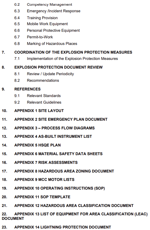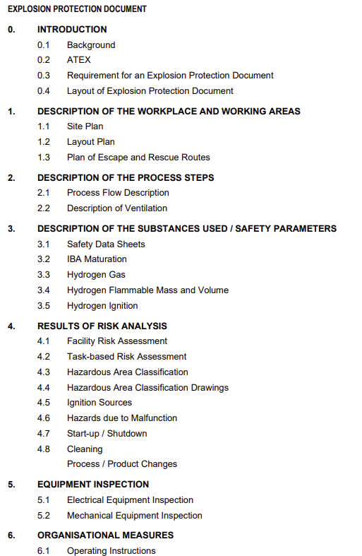 즉, 폭발 방지 문서(Explosion Protection Document)는 폭발 위험이 있는 환경에서 사용되는 장비와 시설이 안전 기준을 충족하는지 증명하기 위한 문서이며, 문서의 작성 예시는 국제 표준인 IECEx OD 017 및 유럽의 ATEX 지침에 따라 장비의 발화원 분석, 방폭 개념, Zone 규정, 환기 시스템 설계, 노후 장비 평가 등이 포함된다.