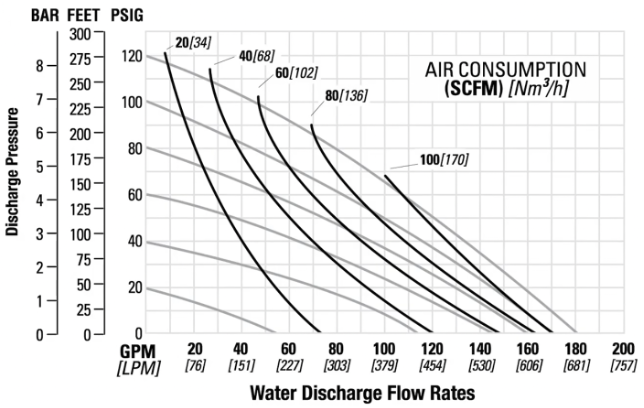 위의 경우 200l/m의 액체유량을 4bar의 discharge pressure로 이송시키기 위해 요구되는 공기유량은 60scfm이 예상되며 이 때 공기의 inlet압력은 이 curve를 따라 왼쪽 끝과 만나는 압력인 7bar가 요구된다.