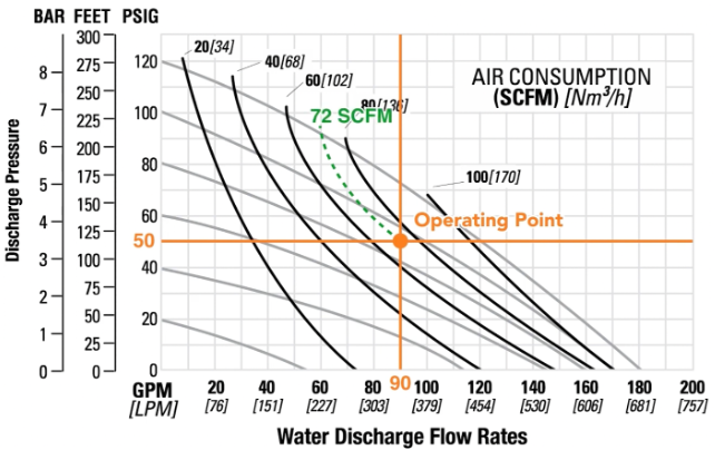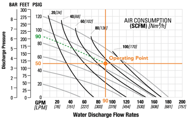 아래 diaphragm pump의 performance curve로부터 후단압력 50psig에서 90gpm을 이송시키기 위해 요구되는 운전점은 아래 교차점이며 이 때 요구되는 air inlet pressure는 회색곡선의 왼쪽 Y축과 만나는 점이며 90psig이다.