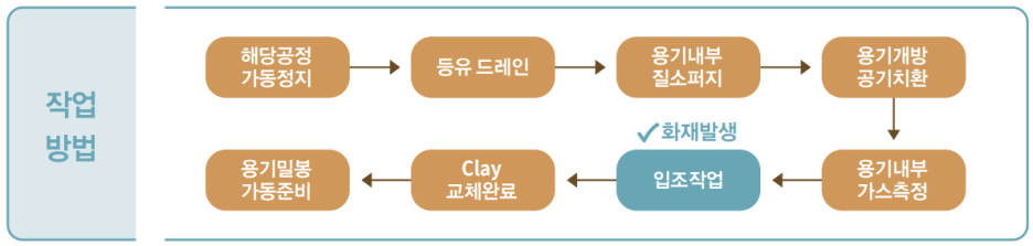 용기 내부에 Clay가 고착되지 않도록 Clay Filter 차압 관리기준에 따른 교체주기를 준수하고, 정상작업 절차를 준수하는게 중요하다. 충분한 ‘내용물 Drain 및 Purge 작업’을 수행하기 위해 업무 절차서에 스팀 퍼지 절차 추가 및 퍼지 완료를 확인할 수 있는 적합한 방법(열중량 시료분석 등)을 추가하여 충진물 내부에 체류되어 있는 등유의 농도를 확인하는 절차가 필요하다.