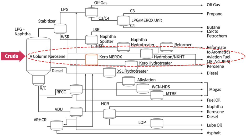 Kero Merox 정제공정: 원유(Crude) 정제공정에서 생산된 등유(Kerosene) 중의 Mercaptan을 이황화물 (Disulfide) 형태로 전환하는 공정이다.