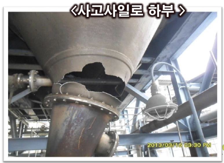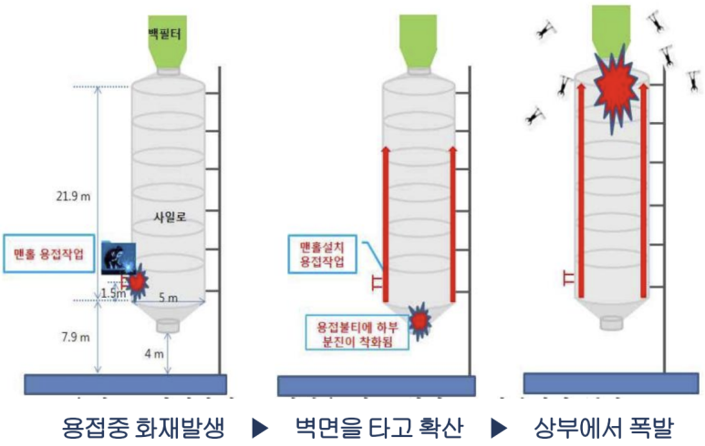 - 가연성물질인 HDPE가 저장되었던 사일로에 대한 용접작업에 앞서 HDPE가 완전히 제거되지 않았으며, (가연성 분진을 제거하지 않은 상태에서 용접실시)