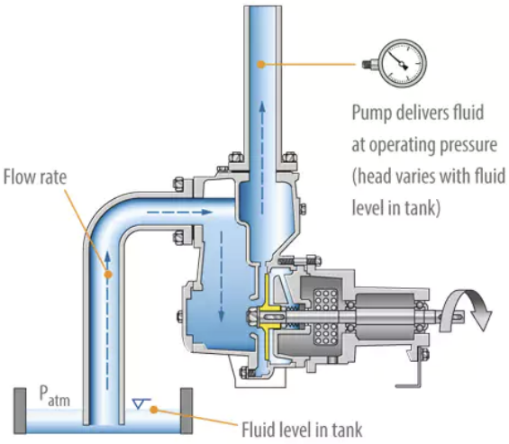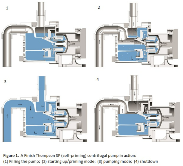 self priming pump는 inner pump나 volute를 flooding시키는 external casing으로 설계되며 power가 공급되면 임펠러가 회전하면서 중심부 아이에 저압이 형성되어 진공이 만들어지면 suction line을 따라 아래에 있던 액체가 위로 올라와 배관상의 air를 pump casing내로 밀어낸다. 그래서 pump 내부에서 공기와 물이 섞이고 이후 chamber에서 공기는 물과 분리된 후 배출구를 통해 배출된다. 공기가 모두 물로 치환되면 이제는 다른 원심펌프처럼 운전을 한다.