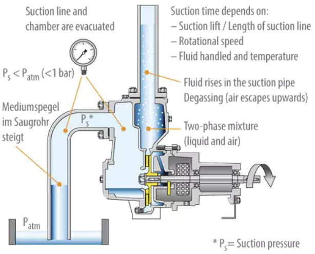 펌프 중심부는 원심펌프기술로 운전이 되지만 추가적인 설계가 반영되어 내부의 공기를 배출할 수 있도록 운전이 된다. 펌프 housing내부에 적당한 물이 채워져 있으며 초기 start-up을 하면 임펠러가 회전을 하고 이 때 저압영역이 생성하며 펌프 casing내로 공기와 액체를 pulling한다.